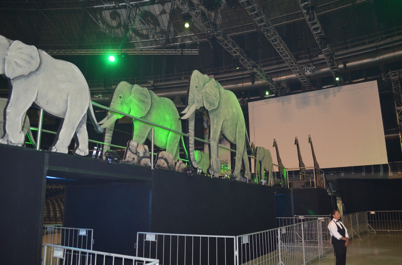 This project has been all over the world and I have travelled with it, learning how different countries and venues operate with local customs, restrictions, and work practices. It has been interesting fun and challenging. From Johannesburg to Bali, Dubai to Budapest, every venue and every supplier we find in these towns, has their own specific way of working that makes you adjust expectations, some in a negative, but mostly in a positive way. In some places where scenic work is cheaper than say in Europe, it is possible to go to town, as we did in Johannesburg with a parade of hand painted 2D life size animals along the 30m catwalk leading to the stage. In other countries, Singapore for instance, everything was so expensive, that we had to minimise expectations and rely on tech, screens etc, to fill the space as it was comparatively cheap for a sqm cost.